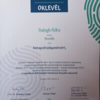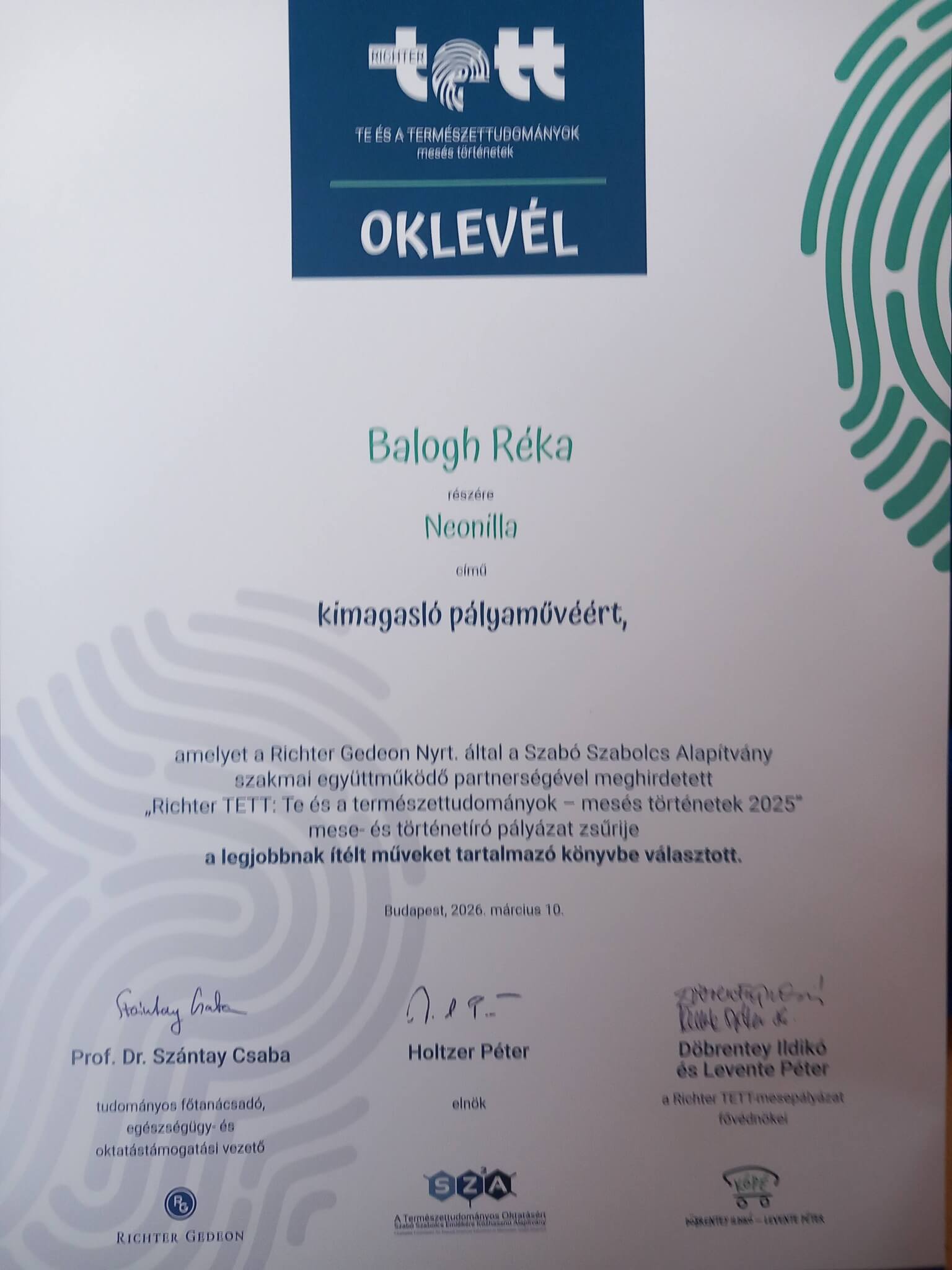 Balogh Réka 5. osztályos tanulónk 2026. március 10-én díjazott lett a Richter TETT: Te és a természettudományok – mesés történetek 2025 a Richter Gedeon Nyrt. által a Természettudományos Oktatásért Szabó Szabolcs Emlékére Közhasznú Alapítvány szakmai együttműködő partnerségével meghirdetett természettudományos mese- és történetíró pályázaton. A pályázat fővédnökei Döbrentey Ildikó és Levente Péter voltak. A pályázat eszmei támogatója az Oktatási Hivatal.