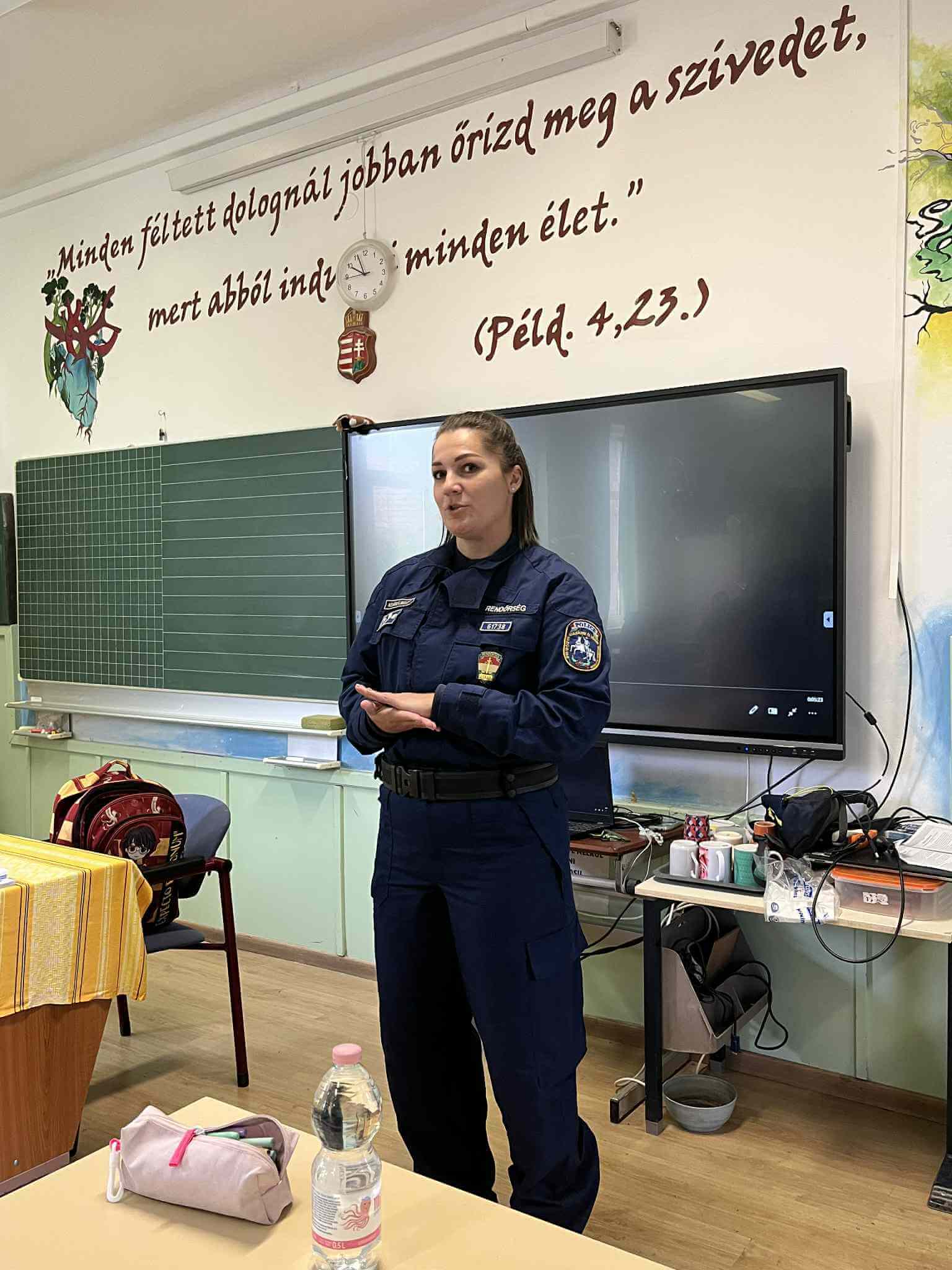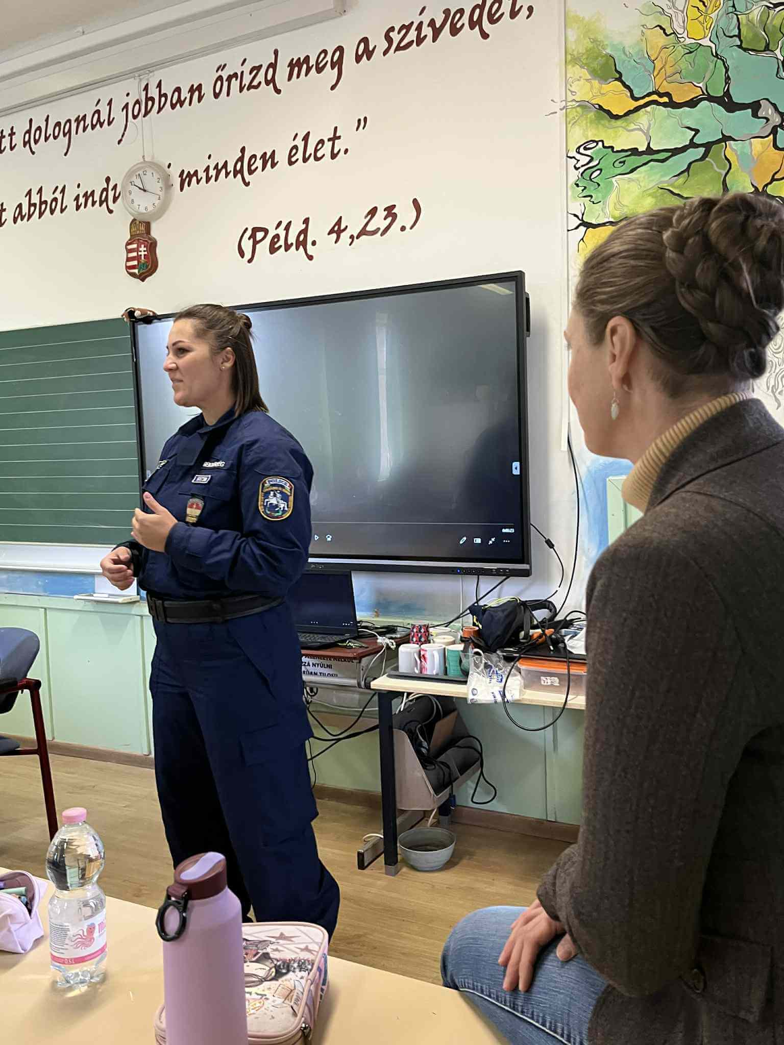 Ezt követően a Rendőrség képviselői vették át a terepet. A tanulók megismerkedhettek a járőrautóval, sőt, bele is ülhettek. A főtörzsőrmester asszony egy rövid, ötpereces kisfilmet mutatott be a rendőrség mindennapi munkájáról, amelyből kiderült, milyen sokrétű és felelősségteljes feladataik vannak. A vetítés után a gyerekek bátran kérdeztek – a közlekedésbiztonságtól kezdve egészen a nyomozói munkáig –, a válaszok pedig sok érdekességet tartogattak.