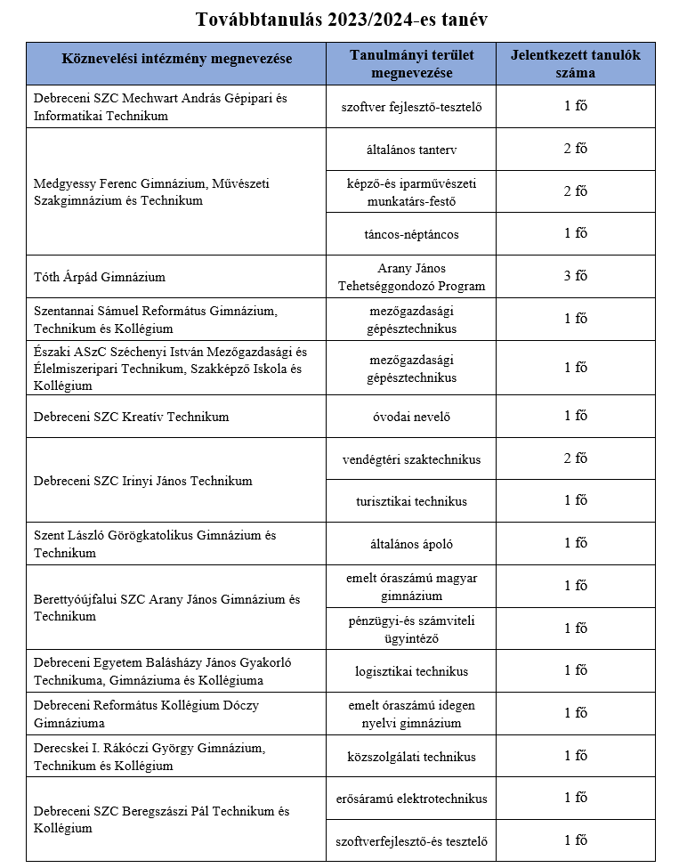 A 2023/2024-es tanévben végzett 8. osztályos tanulóink az alábbi intézményekben folytatják tanulmányaikat.