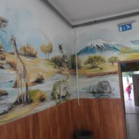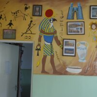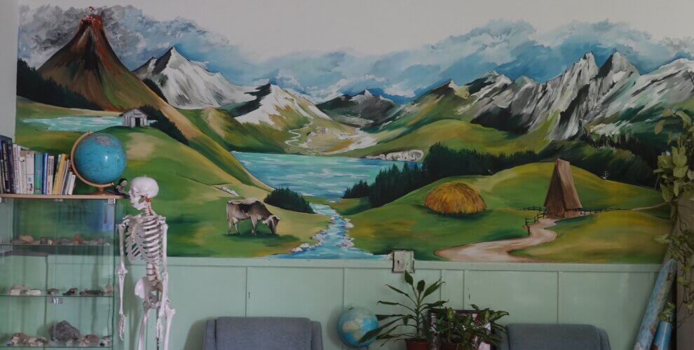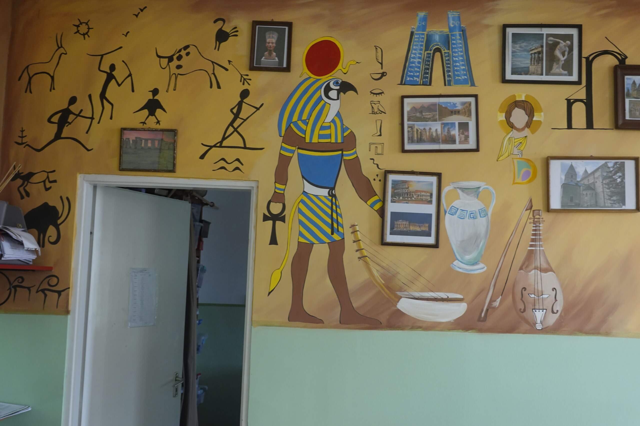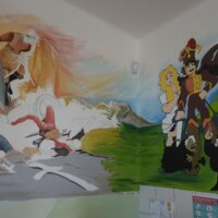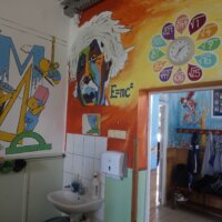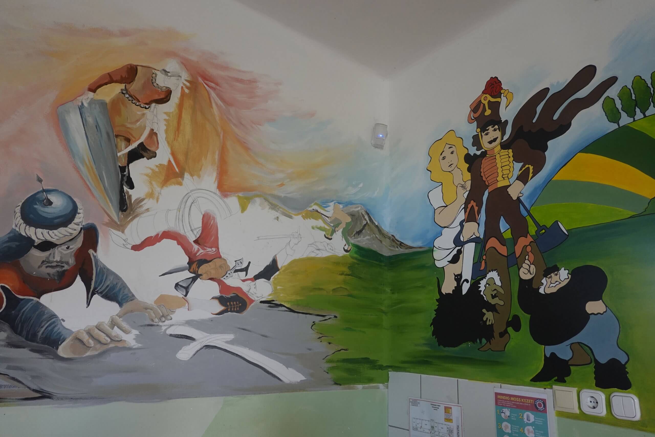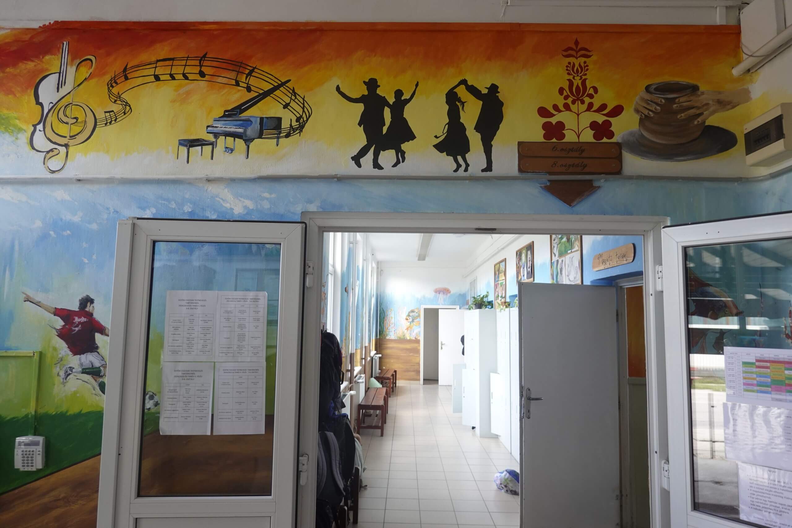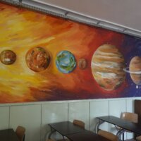 Ferenczi Tünde tanárnő, iskolánk természettudományokat tanító pedagógusa, s egyben grafika tanszakunk vezetője, nem kisebb vállalást tett, minthogy felsős iskolaépületünk egykori átlagos, nem túl izgalmas belső terét újrafesti, tematikusan, az oktatás szolgálatába állítva. Csatlakoztak hozzá többen grafikás növendékei közül, így vált végül közös alkotótérré iskolaépületünk.