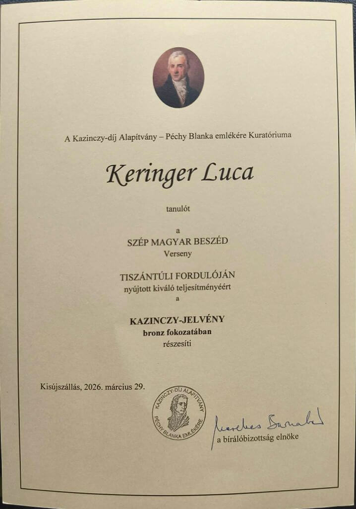 A rangos zsűri döntése alapján Luca a kiváló teljesítményével a Kazinczy-jelvény bronz fokozatát nyerte el.