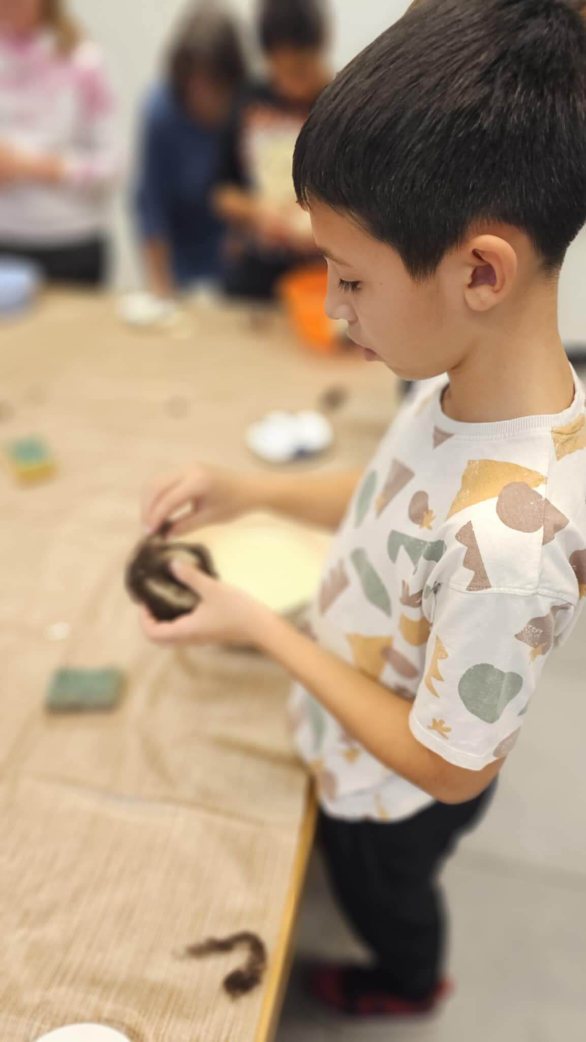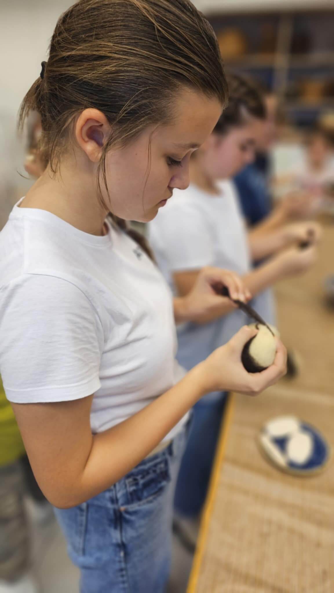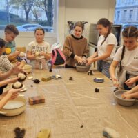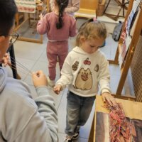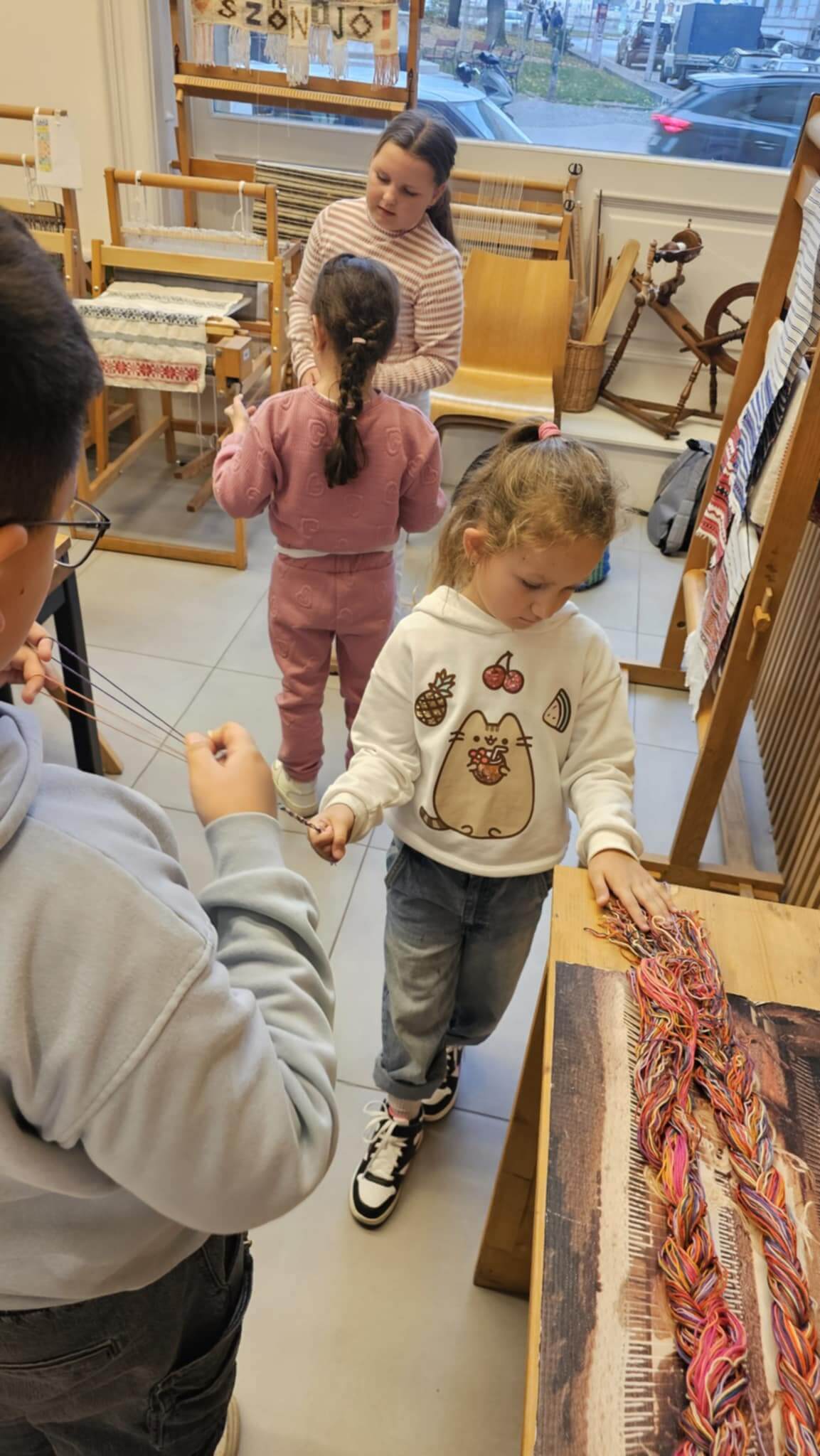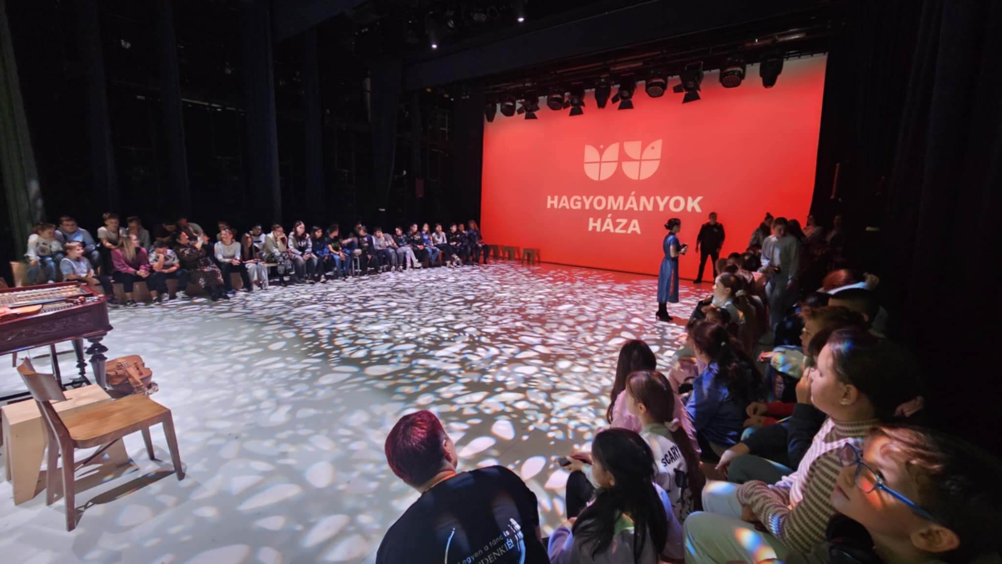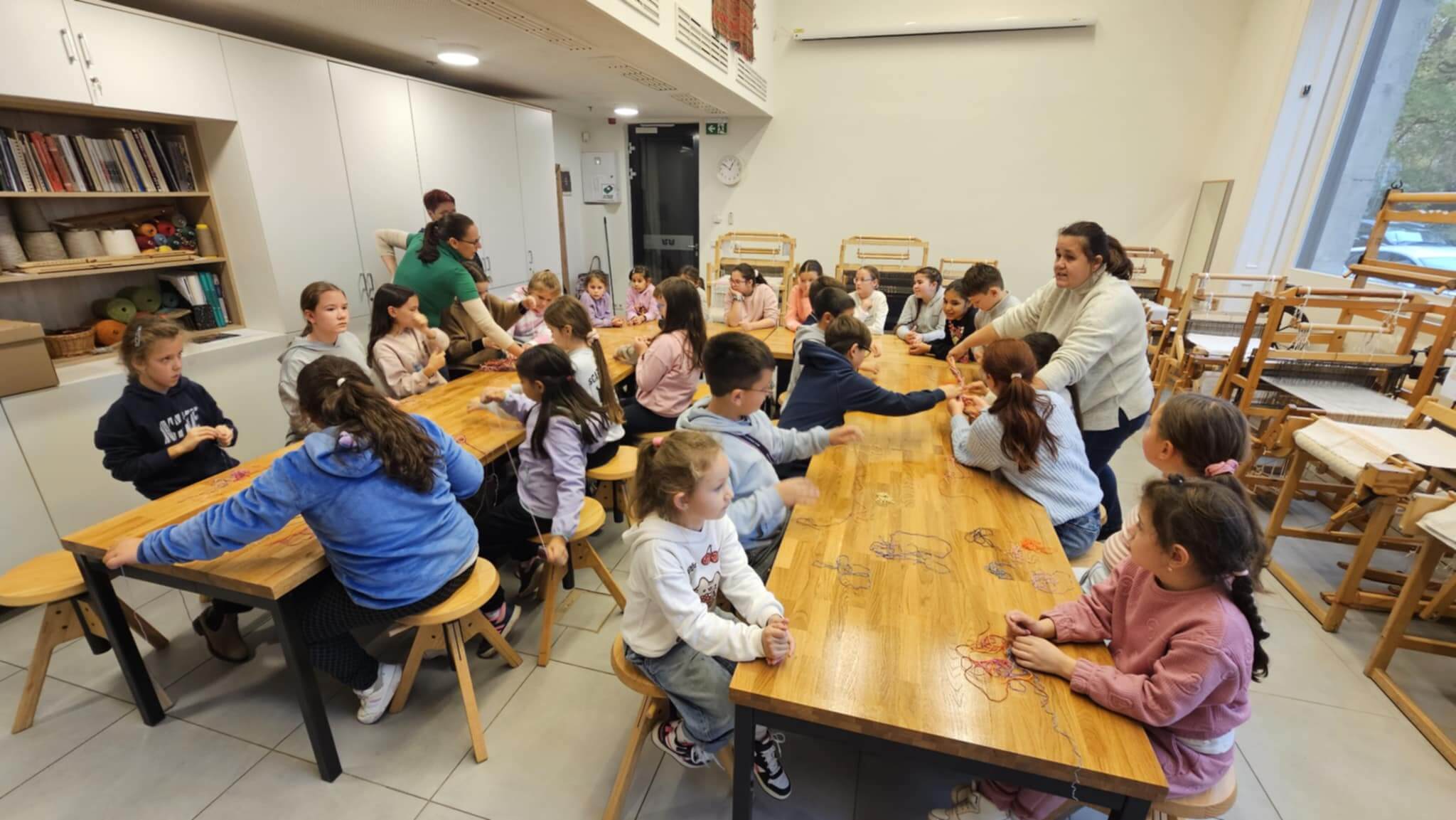 Később, bepillantást nyertünk a Hagyományok Háza néhány műhelyébe, ahol nemezeltünk, körmönfontunk, és a profi táncosokkal, valamint az Állami Nép Együttes zenekarával együtt mulattunk és játszottunk.